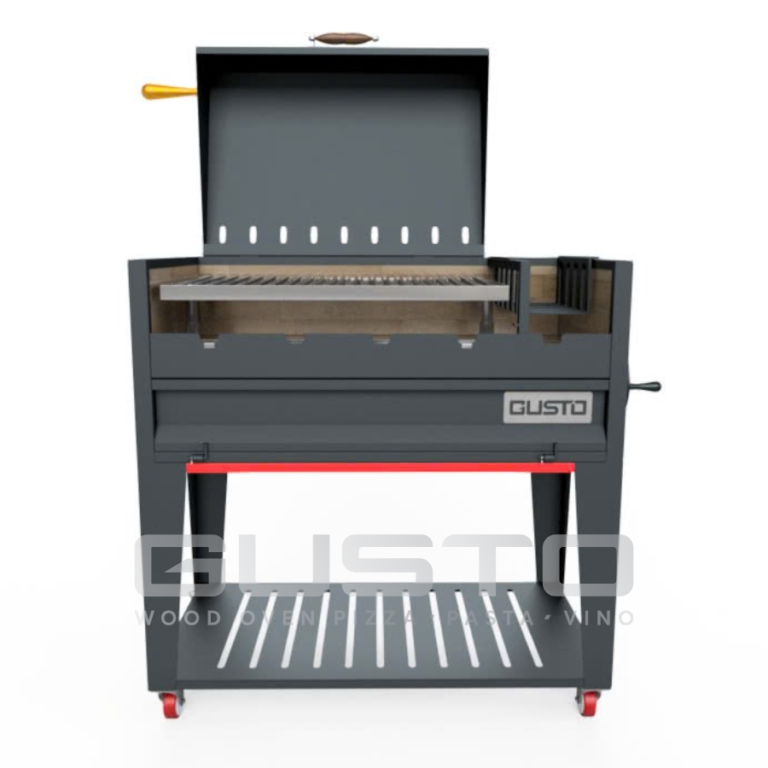 The Gusto Santa Maria Argentine Charcoal Grill 990 is a high-quality, South American-style grill designed for both commercial and personal use. Built from steel and 304 stainless steel with heat-resistant brick-lined walls, it ensures superior durability and thermal insulation. Featuring a crank handle system for precise height adjustments, it allows perfect temperature control. The wood-burning tray creates direct red embers, enhancing flavor and efficiency. With a sleek, professional design and easy mobility, this grill is ideal for restaurants, BBQ catering, and grilling enthusiasts seeking authentic Argentine-style cooking.